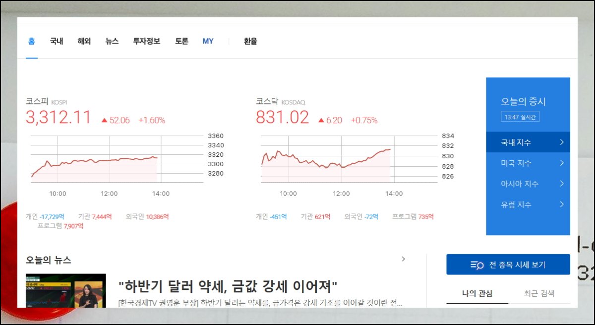 사이트에 접속하면 가장 먼저 코스피와 코스닥의 당일 지수를 확인하게 됩니다. 개별 종목을 살펴보기 전에 전체 시장의 흐름을 먼저 파악하는 것이 현명해요. 오늘의 시장 지수가 개별 주식의 가격에 상당한 영향을 미치기 때문입니다.