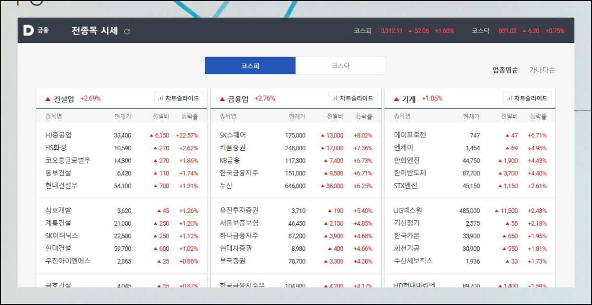이제 당일 전체의 주식시세를 조회할 수 있는 종합 페이지가 화면에 나타납니다. 코스피와 코스닥에 등록된 모든 기업의 주식시세를 한 번에 볼 수 있어요. 업종별로 체계적으로 분류되어 있어서 어떤 산업 분야가 상승세를 보이고 있는지 쉽게 파악할 수 있습니다.