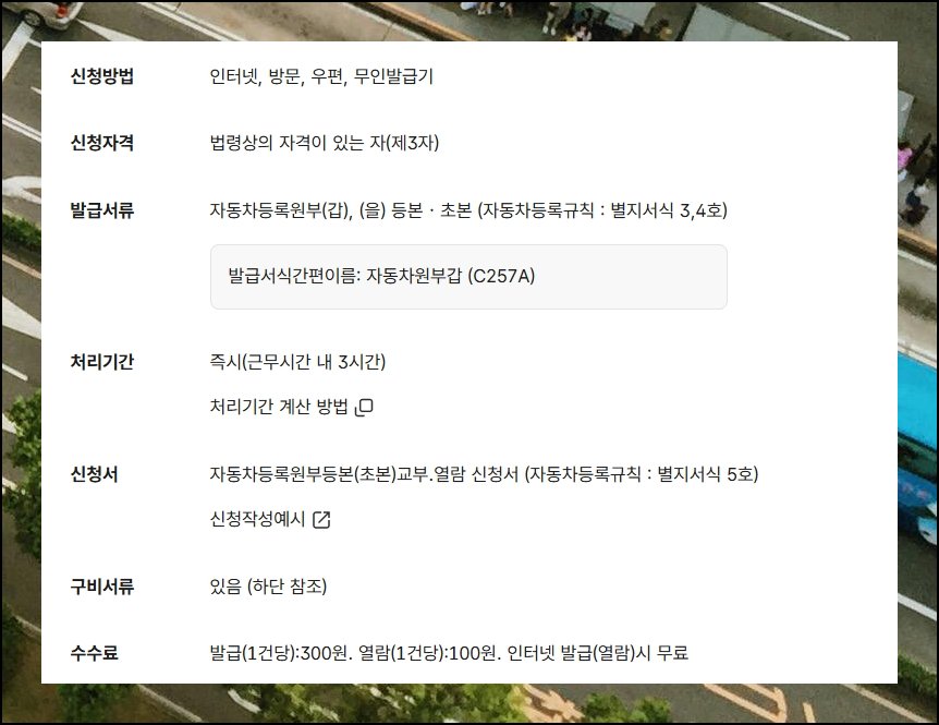 오프라인으로 신청하면 차량 소유자 조회를 위한 열람 서비스는 100원, 발급에는 300원 정도의 수수료가 필요해요. 하지만 인터넷을 통해 열람 및 발급 신청을 하면 이런 비용이 전혀 들지 않습니다. 처리 시간도 근무일 기준으로 3시간 정도면 충분하니까 급하게 필요한 상황에도 큰 문제가 없어요.
