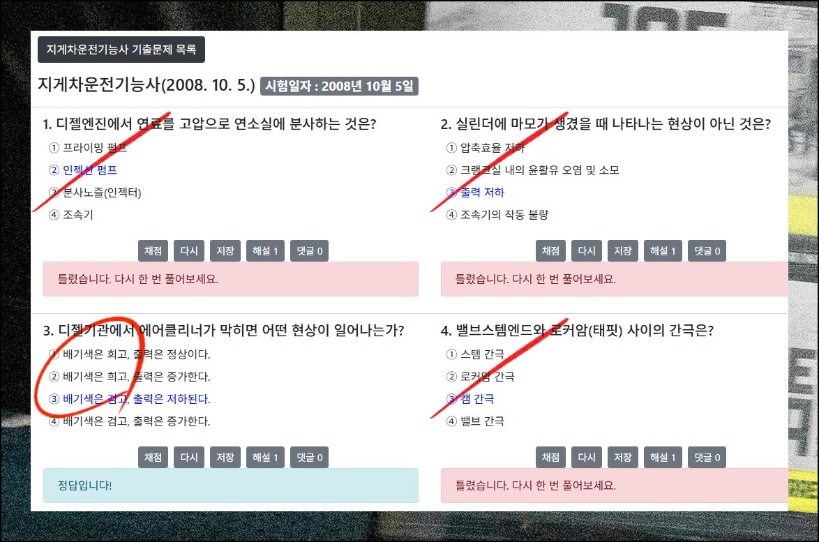 원하는 시험 회차를 자유롭게 골라서 공부할 수 있는 구조예요. 지게차 필기 출제 패턴이 크게 변하지 않아서 과거 문제만으로도 충분히 대비가 가능합니다.