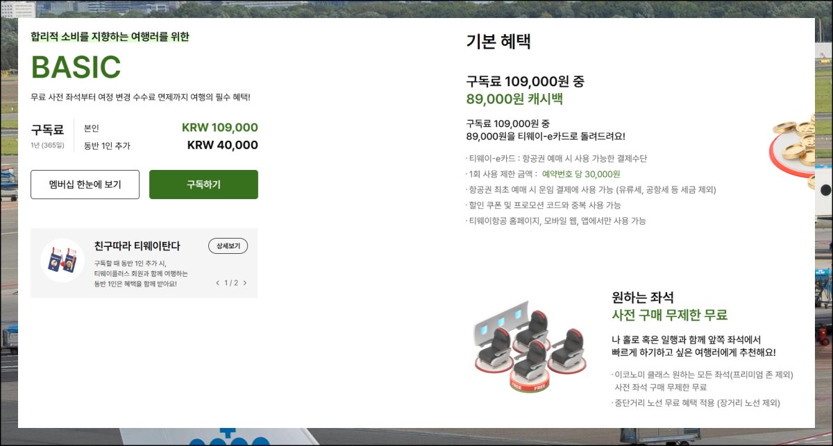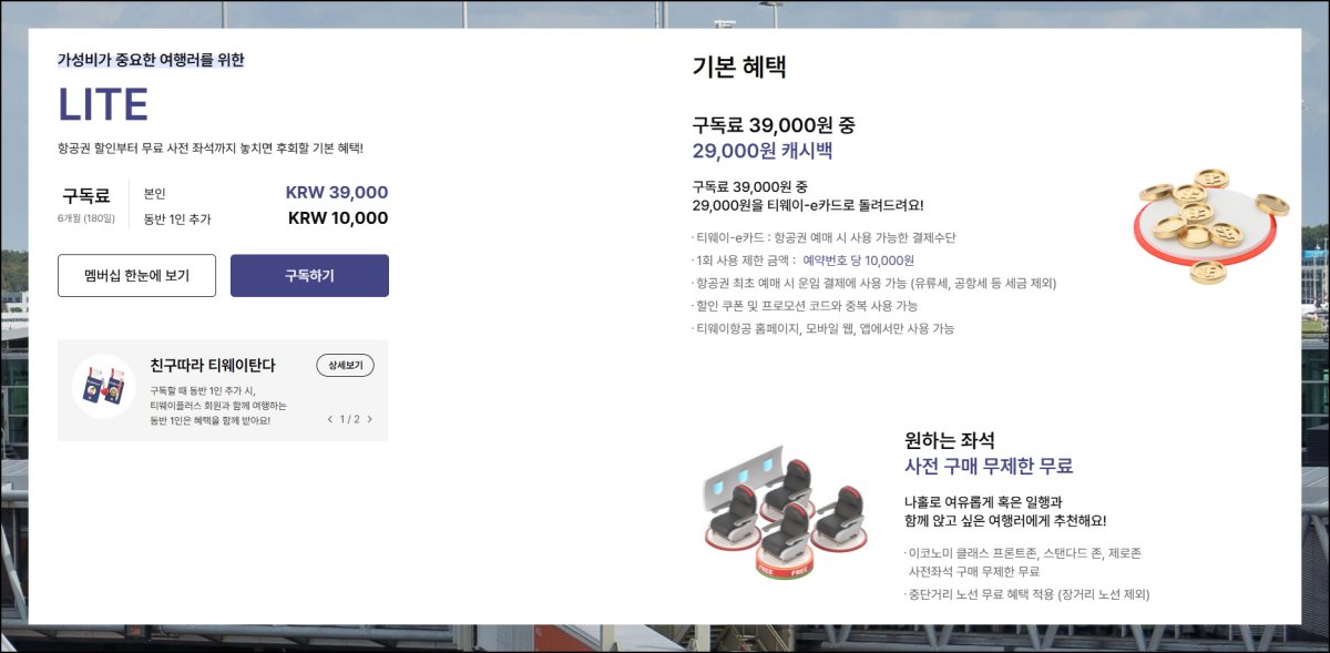 티웨이항공에서 제공하는 멤버십 서비스의 주목할 만한 혜택 다섯 가지를 소개할게요. 멤버십 가입 시 구독료를 지불해야 하는데요. 그 금액의 최대 97%가 포인트로 적립됩니다. 마일리지 형태로 쌓이는 거죠. 항공권 구매할 때 바로 쓸 수 있어요. 추가로 좌석을 미리 골라도 비용이 들지 않고요. 인터넷으로 일정을 변경할 때 수수료가 면제됩니다. 함께 여행하는 사람 한 명에게도 혜택을 나눠줄 수 있습니다.