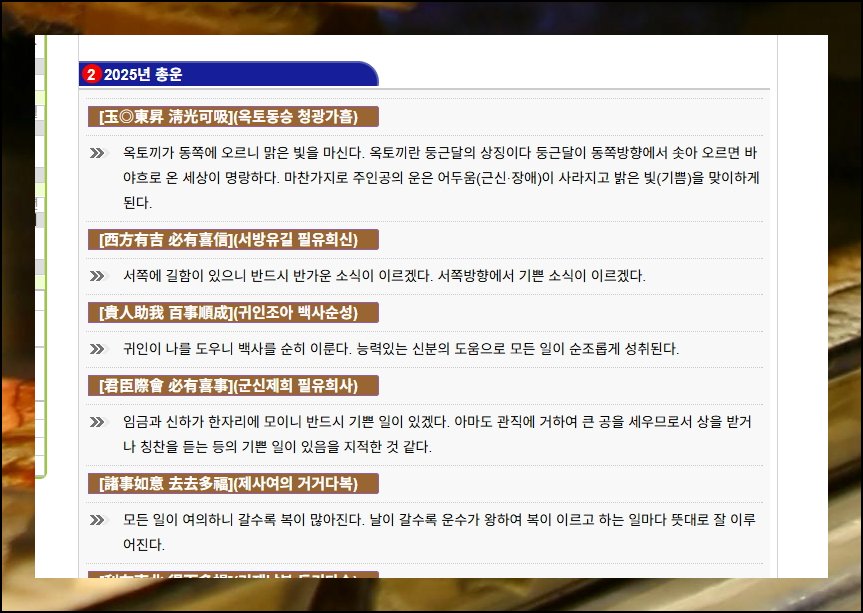 사주를 기반으로 한 한 해 운세는 정말 세심하고 구체적으로 제공됩니다. 사이트마다 조금씩 다른 시각의 해석을 만나볼 수 있지만, 깊이 있으면서도 쉬운 설명 덕분에 누구나 부담 없이 이해할 수 있어요. 1년 전체의 큰 흐름을 미리 파악하면 매달 어떤 태도로 생활해야 할지 감을 잡게 됩니다.
