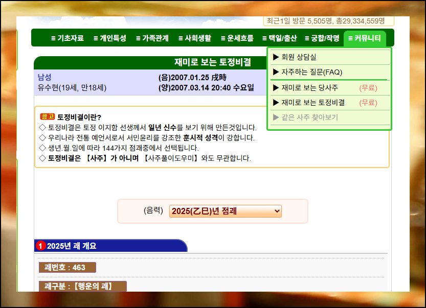 사이트 화면에 있는 메뉴에서 커뮤니티를 선택해 보세요. 유용하고 다채로운 역술 콘텐츠가 준비되어 있습니다. 2025년은 물론이고, 그 이후 연도의 만세력까지 미리 살펴볼 수 있으니까 장기 계획을 세울 때 아주 유용해요. 개인 일정뿐 아니라 가족 모두의 중요한 날들도 함께 고려해서 계획을 짜보세요.