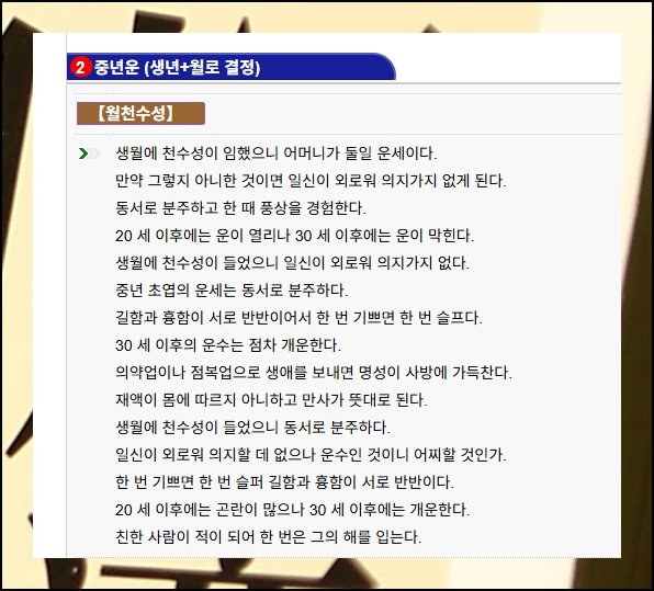 여러분의 소중한 인생 여정에서 믿음직한 안내자 역할을 해줄 사주풀이 무료 사이트를 활용해보세요. 초년운부터 부부운까지 삶의 모든 영역에 걸친 풍성한 이야기를 들려드립니다. 당사주도 함께 보면 여러 자신의 삶에 대한 평생운을 볼 수 있는데요. 나름 잘 맞고, 재미있게 보기에도 좋습니다.