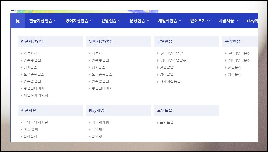 타닥타닥은 다양한 키보드 학습 과정을 갖추고 있어요. 처음 이용하는 분들은 한글 자판부터 시작하는 게 좋습니다. 기본자리를 시작으로 왼손윗글쇠, 검지글쇠, 왼손밑글쇠, 오른손윗글쇠 같은 여러 코스가 마련되어 있죠. 순서는 본인이 원하는 대로 골라서 할 수 있지만요. 처음부터 차례대로 따라가는 걸 권합니다.