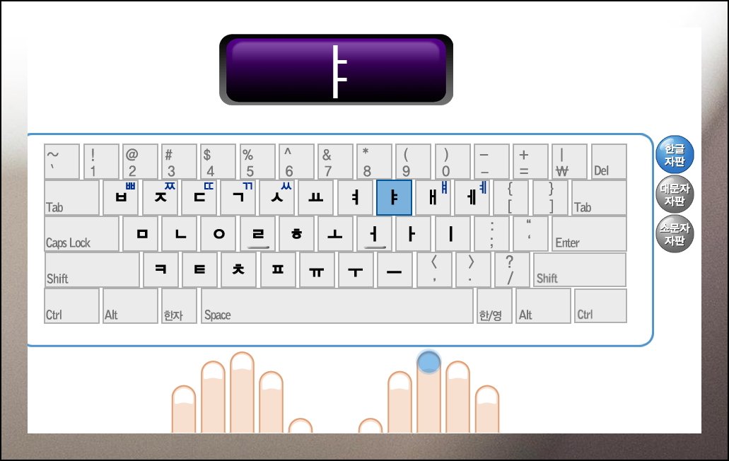 기본 자리를 익힐 땐 화면에 표시된 한글 자판의 글자를 보고 따라 입력하면 돼요. 어떤 손가락을 써야 하는지 화면에 하이라이트로 나타납니다. 그래서 헷갈리지 않고 쉽게 따라할 수 있죠. 직관적인 안내 덕분에 처음 도전하는 이도 부담 없이 배울 수 있어요.