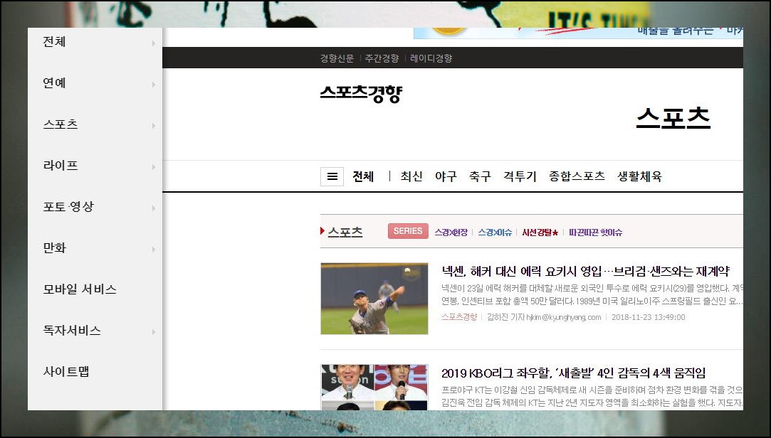스포츠경향 사이트의 이름에서 알 수 있듯 스포츠 관련 뉴스가 메인이지만 만화 코너도 잘 준비되어 있어요. 만화 페이지로 이동하는 방법은 생각보다 간단합니다. 화면 상단에 있는 전체 메뉴 버튼을 클릭해주세요. 그러면 좌측에 카테고리 목록이 나타나는데 여기서 웹툰 항목을 선택하면 바로 전용 공간으로 이동할 수 있어요.